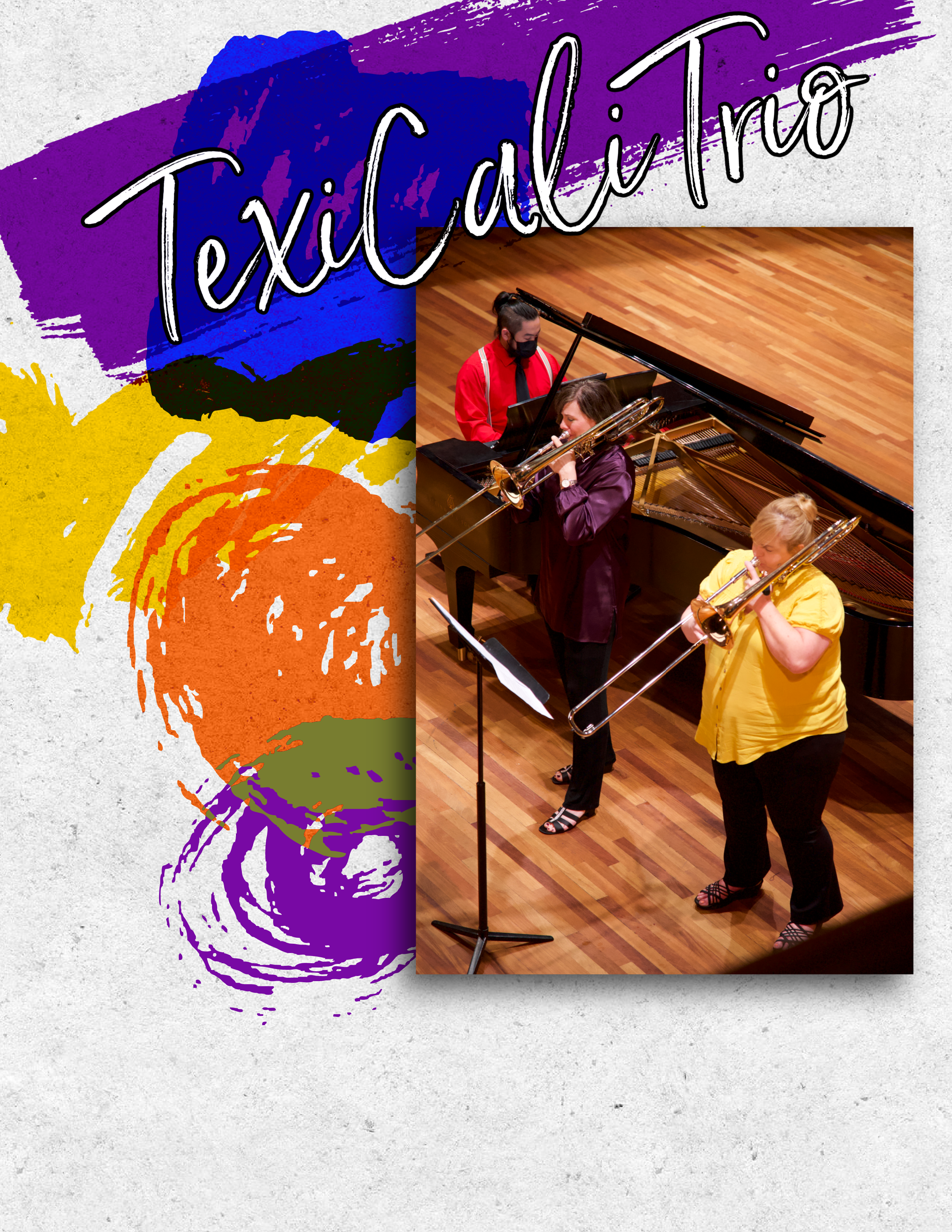 The TexiCali Trio is an ongoing collaboration between Dr. Karen Marston, Professor of Music at Mt San Antonio College (California) and Dr. Deb Scott, Professor of Trombone at Stephen F Austin State University (Texas). The group is a natural extension of the long standing friendship between Deb and Karen, who met on a gig in Houston, Texas, in 1999. Knowing at that time that were the only two professional female trombonists in the area, they formed a close bond, which has endured many years and many miles. TexiCali was officially named in 2021, after Deb and Karen had already formed a habit of sharing recitals and working together on commissions of new music. Since that time, TexiCali has performed at the International Trombone Festival and the International Womens Brass Conference, and has given recitals at numerous universities, including Ohio University, Northern Kentucky University, and Wright State University. In 2021, together with pianist Dr. Jason Lo, TexiCali commissioned and premiered Justin Writer’s Spectrums, for two trombones and piano.